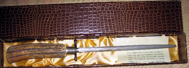 Messerschärfer mit Hirschhorngriff für Jäger, unbenutzt, 33 cm insgesamt.