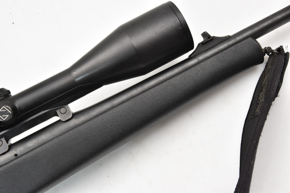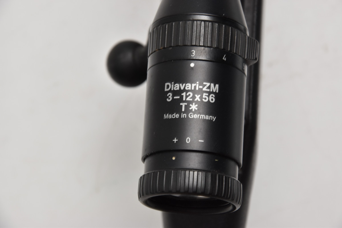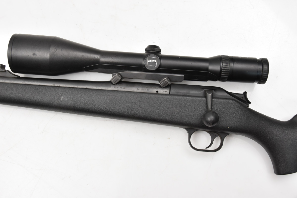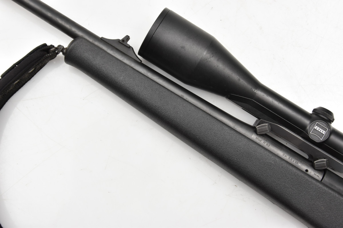 Sie bieten hier auf eine gebrauchte Blaser Repetierbüchse Modell R93 Offroad FÜR LINKSSCHÜTZEN im weitreichenden deutschen Magnumkaliber 6,5x68. Der Lauf in Standardkontur ist ca. 63 cm lang und mit der Mag-Na-Port Mündungsbremse versehen. Der unverwüstliche schwarze Kunststoffschaft mit geradem Rücken und Gummischaftkappe ist bis zum Abzug ca. 36 cm lang. Auf der Waffe ist mittels Sattelmontage ein hochwertiges, variables und lichtstarkes Zielfernrohr Zeiss Diavari-ZM 3-12x56 T* mit dem weniger bekannten, aber sowohl für den flüchtigen wie präzisen Schuß idealen Absehen 7 montiert.