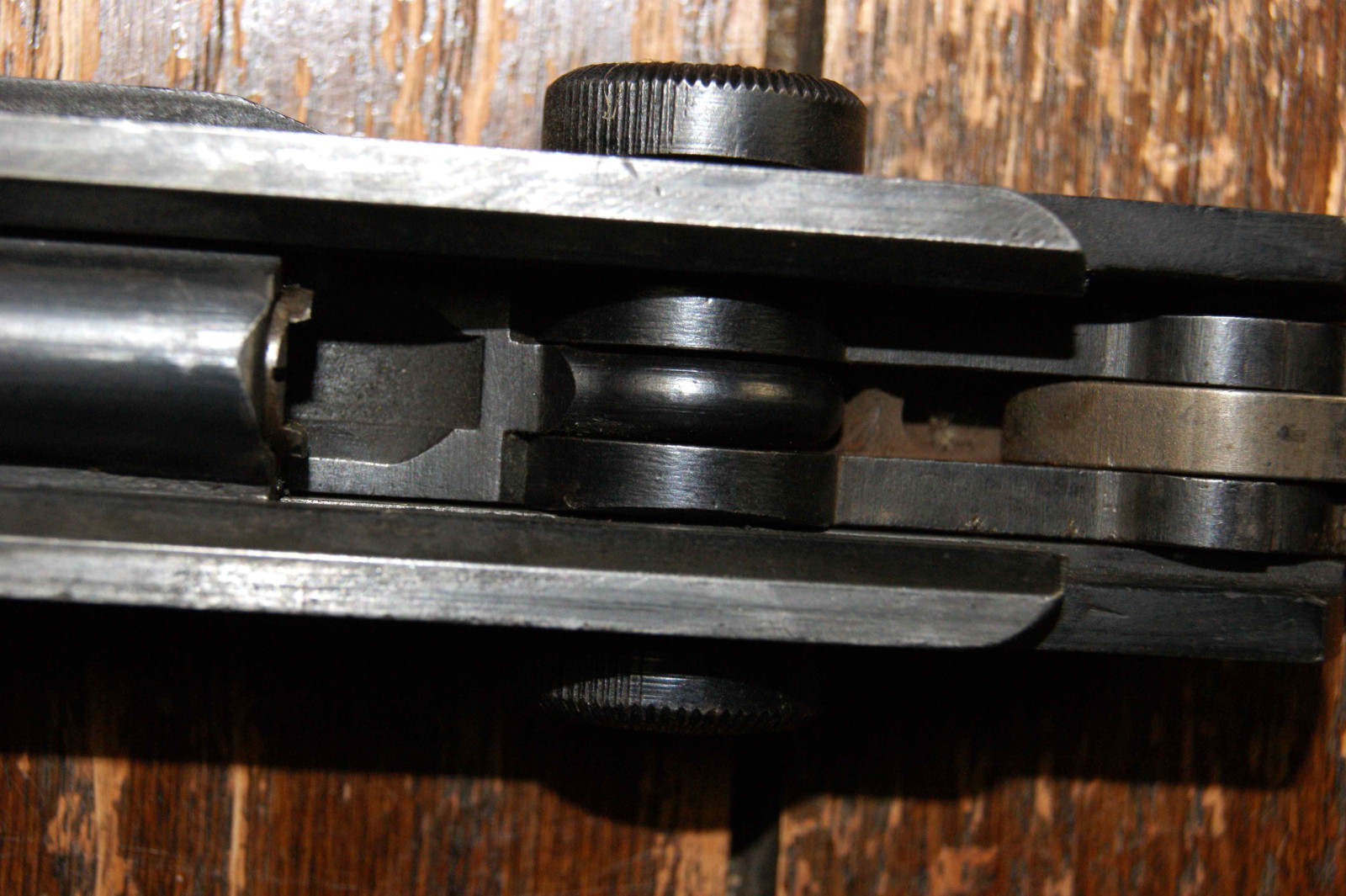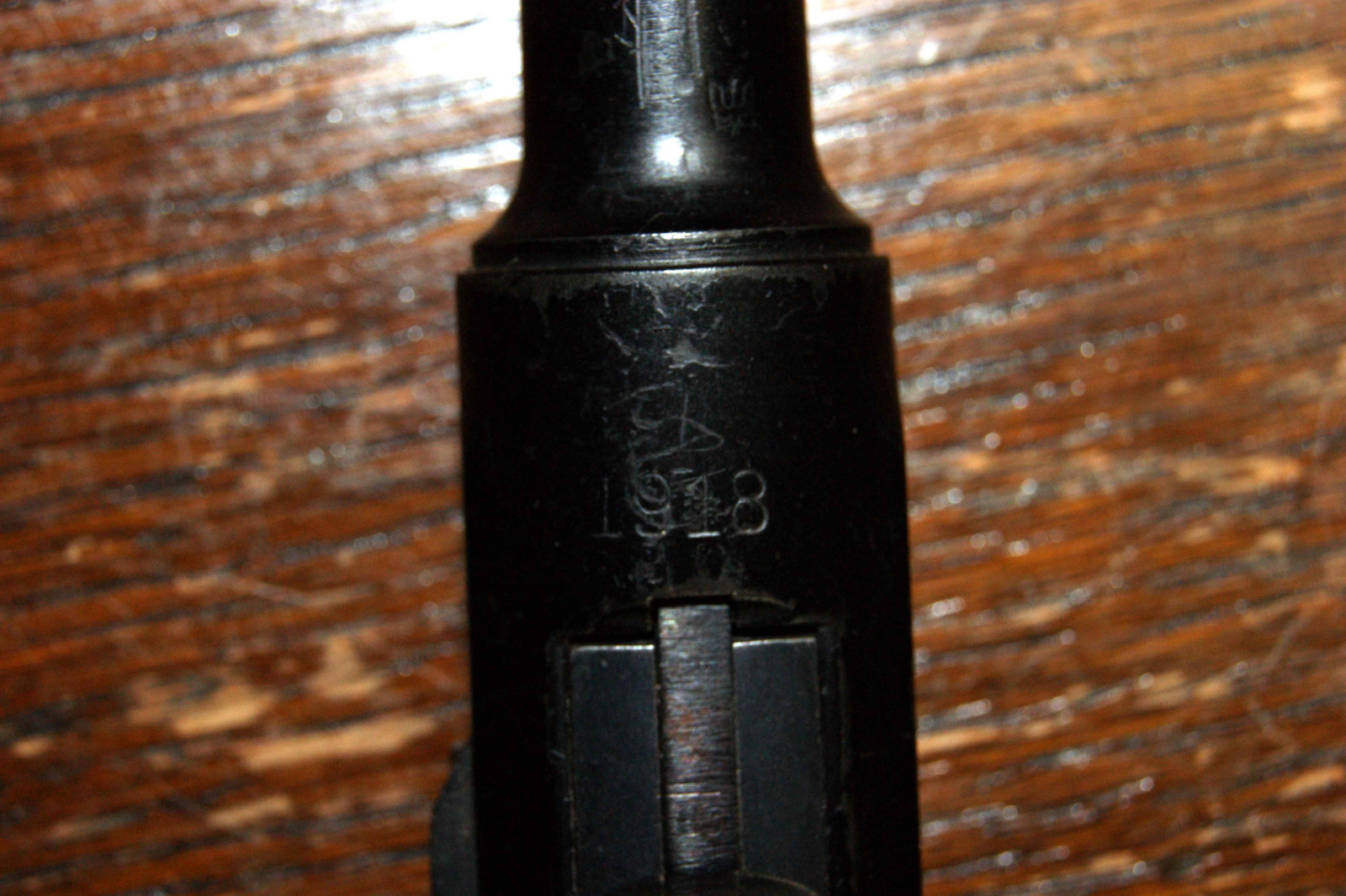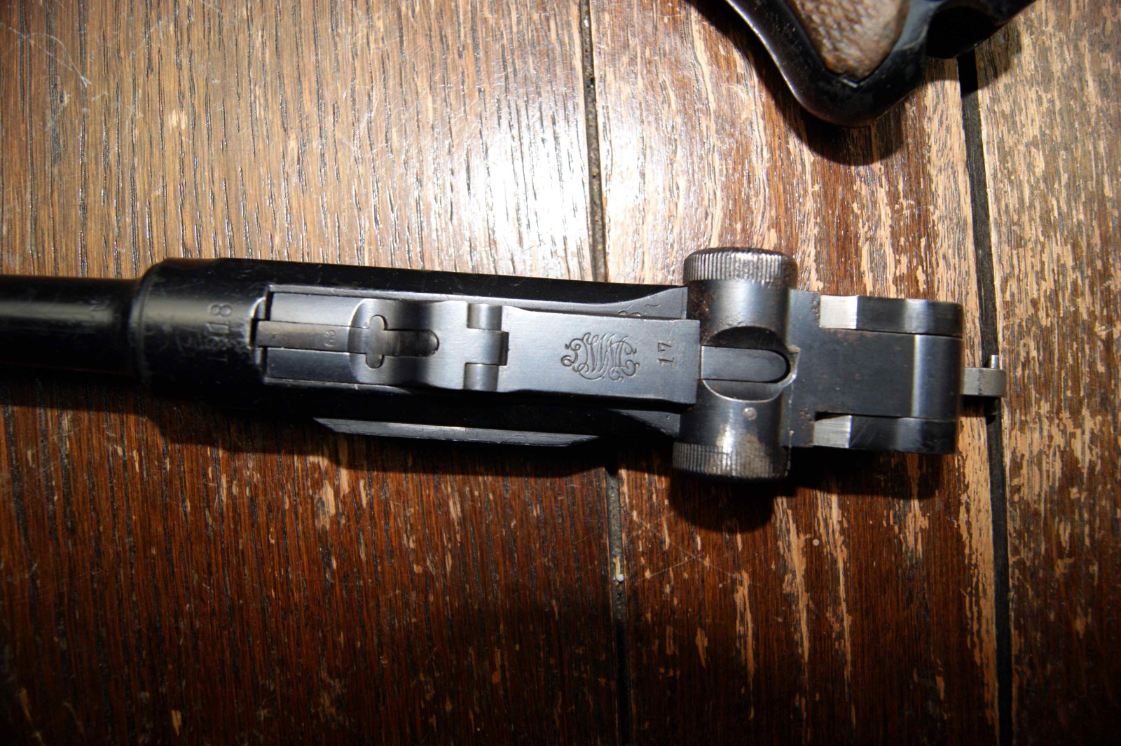 Zum Verkauf kommt ein Opfer vom "Bastelwastel", eine an sich schöne P08, nicht nummerngleich, mit einen ca. 20mm langen Gewinde im Mündungsbereich und ein angefeiltes Gabelstück ( siehe Bilder ), die Waffe hat einen Englischen Beschuß.