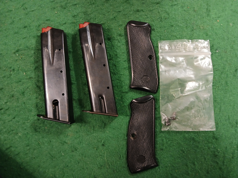 Verkaufe Ihr zwei Magazine und Griffschalen für CZ 75 Pistole in 9mm an.
