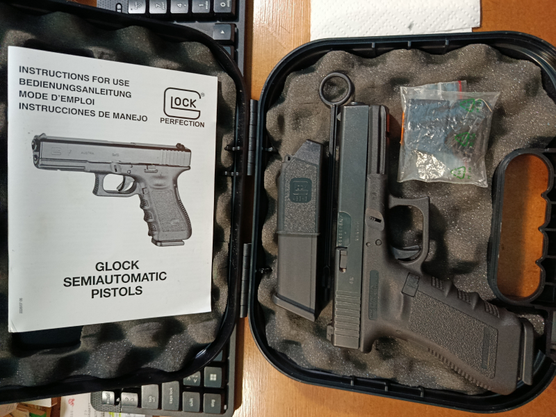 Nach langer Zeit in Dunkelhaft (Waffenschrank) wegen Nichtverwendung kommt nun eine nahezu unbenutzte GLOCK 17 wahrscheinlich Gen. 3 ???? als FULL-SET mit original Koffer ans Tageslicht und wird verkauft.