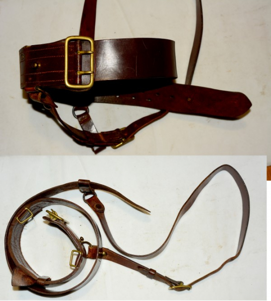 Braunes Koppel mit Schulterriemen, Koppelriemen 114 cm lang und 5,4 cm breit, unten 3 Ösen für Ausrüstung und Dolch/Säbel, sehr guter Zustand mit leichten Gebrauchsspuren