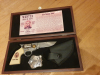 Jesse James Holzschatulle mit einem Messer in Revolverform und einem Detektiv-Abzeichen aus Metall.
