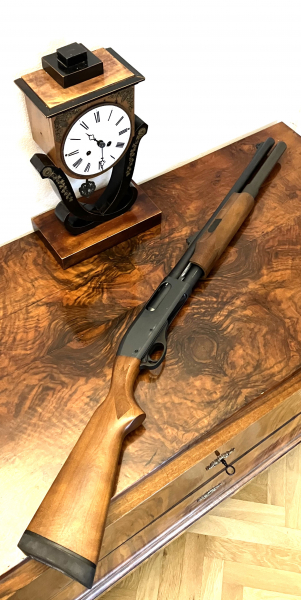 Versteigert wird die abgebildete Vorderschaftrepetierflinte. Die Waffe wurde vom Besitzer, einem Pfarrer, gut genutzt und weist entsprechende Gebrauchsspuren auf. Das Laufinnere habe ich nicht vollständig sauber bekommen. Die Flinte ist voll funktionsfähig und eignet sich eher für Praktiker als für Sammler. Aufgrund des Büchsenvisiers eignet sich die Flinte besonders für das Schießen mit Slugs auf Kurzwaffenständen. Trotz des Büchsenvisiers verfügt die Flinte zum Glück über keinen Slug-Lauf, sondern über einen echten Flintenlauf :- )