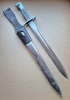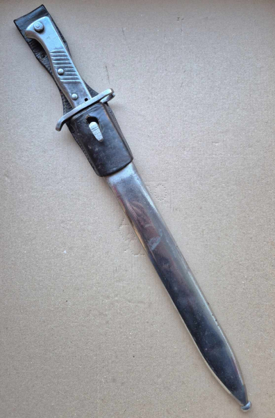 Deutsches Notbajonett (EB 44, Klinge mit kurzer Hohlkehle) aus dem 1.Weltkrieg mit passender Scheide und originalen Koppelschuh. Dieses Modell taucht nicht sehr oft auf dem Markt im guten Zustand auf und dürften in den meisten Sammlungen fehlen. Auf dem Griff und dem Klingenrücken gibt es einige Abnahmestempel. Es hat keinen Rost oder Rostnarben, die Klinge ist ein Traum und wurde nicht beschliffen. Es gibt 1 kleine Dellen auf der Scheide die das zusammenstecken aber nicht stören. Es lässt sich problemlos aufpflanzen und der Trücker geht. Zustand siehe Bilder, bei Fragen einfach melden. Versand in restliche EU 20,00Euro