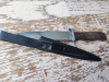 schwarze Scheide mit Lederriemen , der ist leider gerissen .