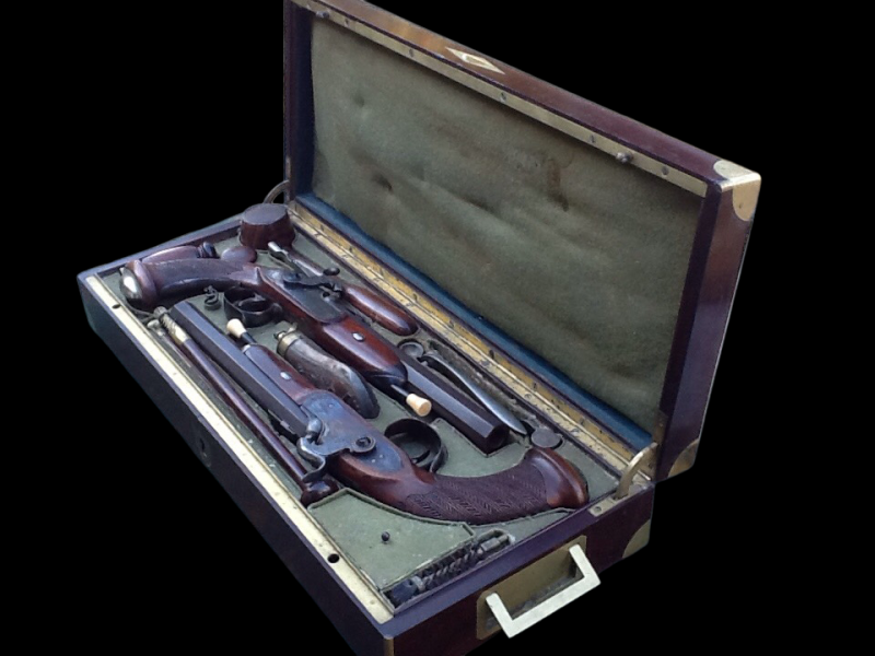 Belgien, Lüttich, um 1850. Vollständiges Set aus der Zeit. Gezogene Läufe.Schaft aus wildem Nussbaumholz.Pistolenlänge: 37 cm.