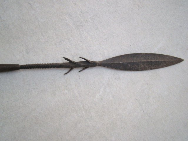 Zum Verkauf steht ein afrikanisches Speer (wahrscheinlich Jagd- bzw. Fischerspeer/Harpunenspeer) mit handgeschmiedeter, mehrfach gezahnter Spitze. Die Klinge ist blattförmig ausgeführt; im oberen Bereich befinden sich seitliche Widerhaken/Barben, typisch für Jagd- oder Fischfangausführungen. Der Holzschaft besitzt im vorderen Bereich eine spiralförmige Metallarmierung (siehe Fotos). Ein sehr dekoratives und sammelwürdiges Stück Ethnographica / Tribal Art.