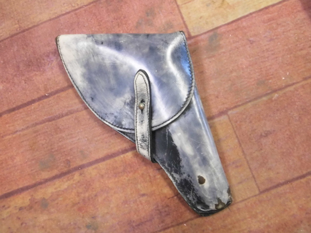 Holster , für S&W Revolver Mod. Military & Police . Ursprünglich in weiß , nachträglich schwarz nachgefärbt , jetzt abgegriffen mit sechs Patronenschlaufen .