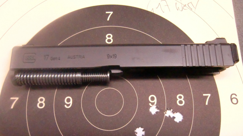 Modell : 17Gen4 9mm Luger ---mit montiertem und eingeschossener Target Stahlvisierung(Kimme wurde nach Erzeugung des Trefferbild in der Werkstatt noch nach links korregiert)