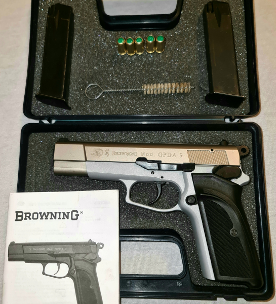 Zum Verkauf steht eine GP DA 9 im Kaliber 9mm Knall/Gas. Mit der PTB 772 *** Beschuss:BK/2019, Köln. *** Bicolour, eine seltene und sehr eindrucksvolle Kombination in Nickel und matt hellgrau.*** Die Schreckschusswaffe ist voll funktionstüchtig. SA/DA und Schlittenfanghebel funktionieren 1A. Eine legendäre Konstruktion des genialen John Moses Browning, der seiner Zeit stets einen Schritt voraus war. Schon mit dem Vorgängermodell bewies Browning seine Innovationskraft. Bis heute vertrauen Militärs und Spezialeinheiten auf der ganzen Welt dieser robusten und wegweisenden Konstruktion. Wie es sich für eine legendäre Browning gehört, ist die GPDA 9 natürlich aufwändig ausgestattet: Sie ist ausgestattet mit einem Spannabzug und neben dem funktionierenden Schlittenfanghebel noch mit einem beidseitig bedienbaren Entspannhebel. Browning GPDA 9 - Die Gas-Signal-Waffe für Profis im Kaliber 9 mm P.A.K., mit schwarzen Kunststoffgriffschalen. Mit dabei ein passendes Ersatzmagazin und 5 Platzpatronen, siehe Fotos . Und natürlich eine Putzbürste. Die Waffe wird im Originalkoffer geliefert, siehe Fotos. Technische Daten:Marke:BrowningModell:GPDA 9System:Schreckschuss-/Reizstoff-/Signal-PistoleKaliber:9 mm P.A.K.Magazinkapazität:9 SchussGewicht:820 g (940 g inkl. Magazin)Lauflänge:124 mmGesamtlänge:195 mmBreite:38 mmHöhe:133 mm *** Abzug:Double Action, Entspannhebel, Ausführung:schwarz , Lieferumfang:Waffe, Reinigungsbürste, 5 Schuss Munition und Bedienungsanleitung***