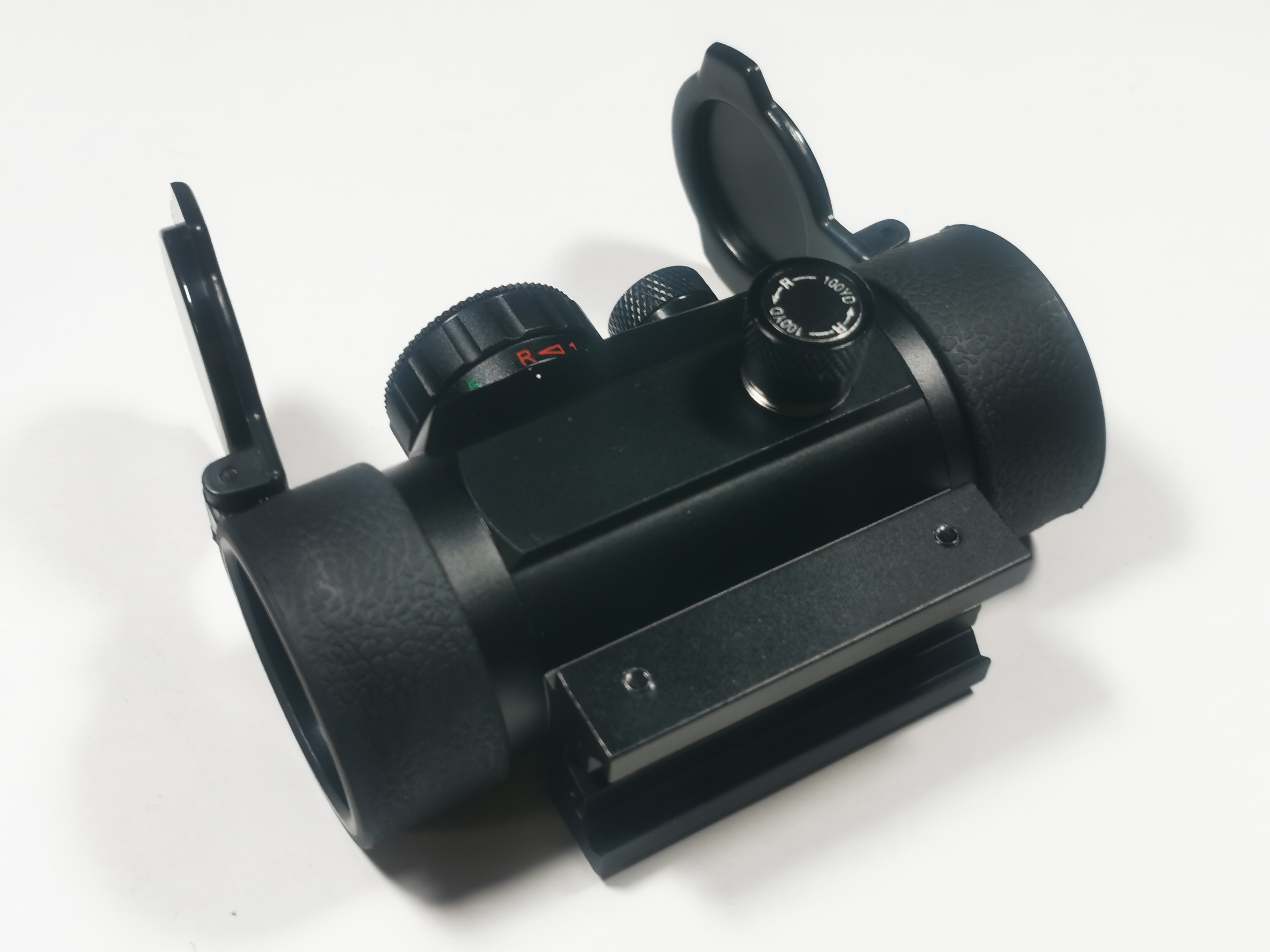 Roter und grüner Punkt können durch drehen des grossen Rades in der Intensität verstellt werden.. Mit Schutzklappen(federnd) , Beschreibung (Englisch) Reinigungstuch, Innensechskant Schlüssel(zur Befestigung auf der Schiene) und Batterie..
