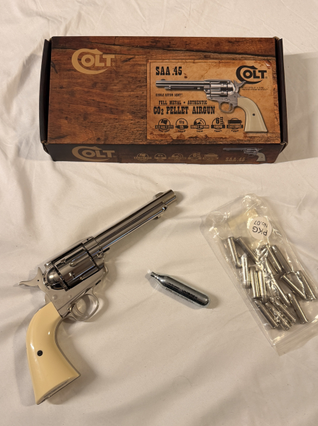 Biete einen Colt Single Action Army .45 CO₂-Luftdruckrevolver im Kaliber 4,5 mm Diabolo, Full-Metal, Nickel-Finish.