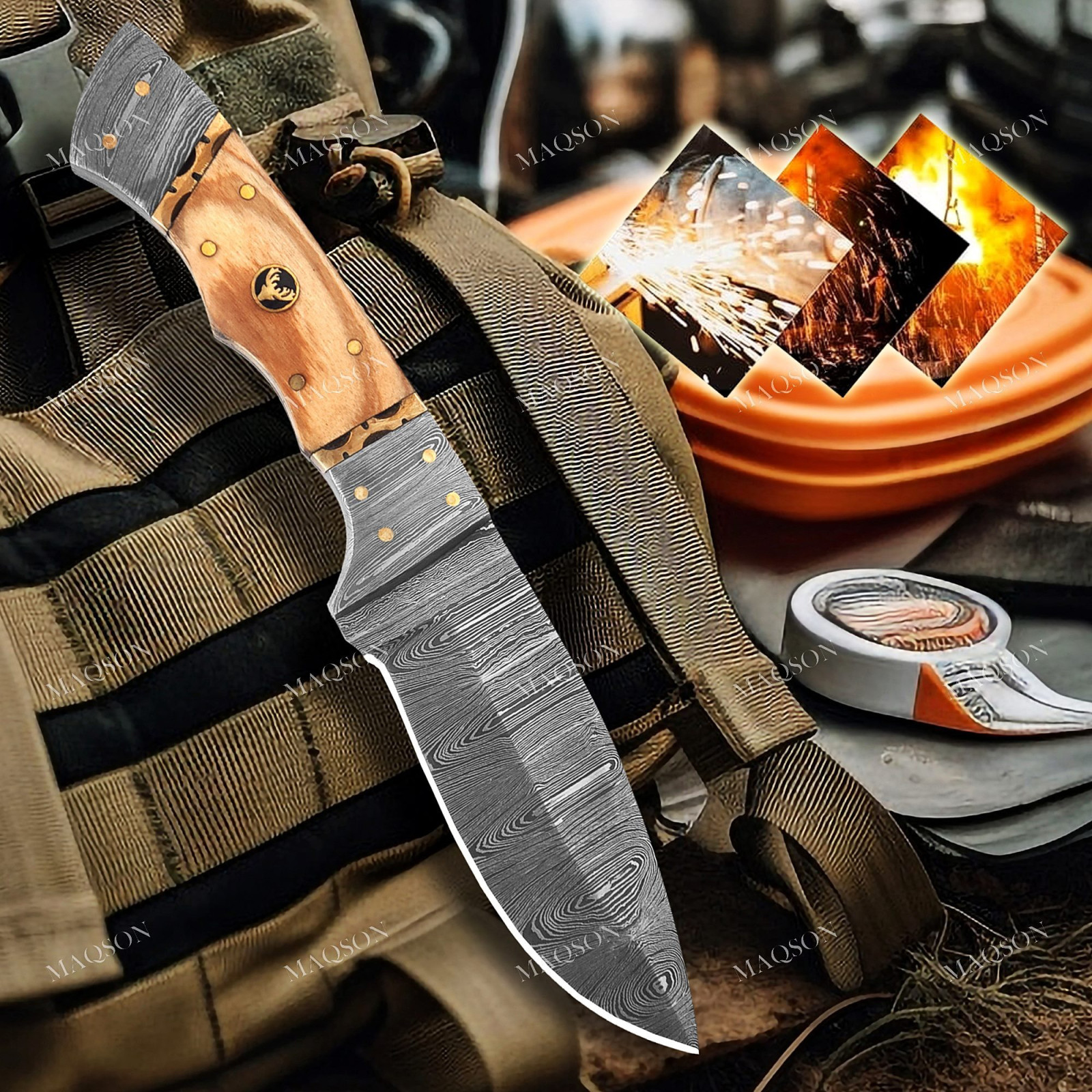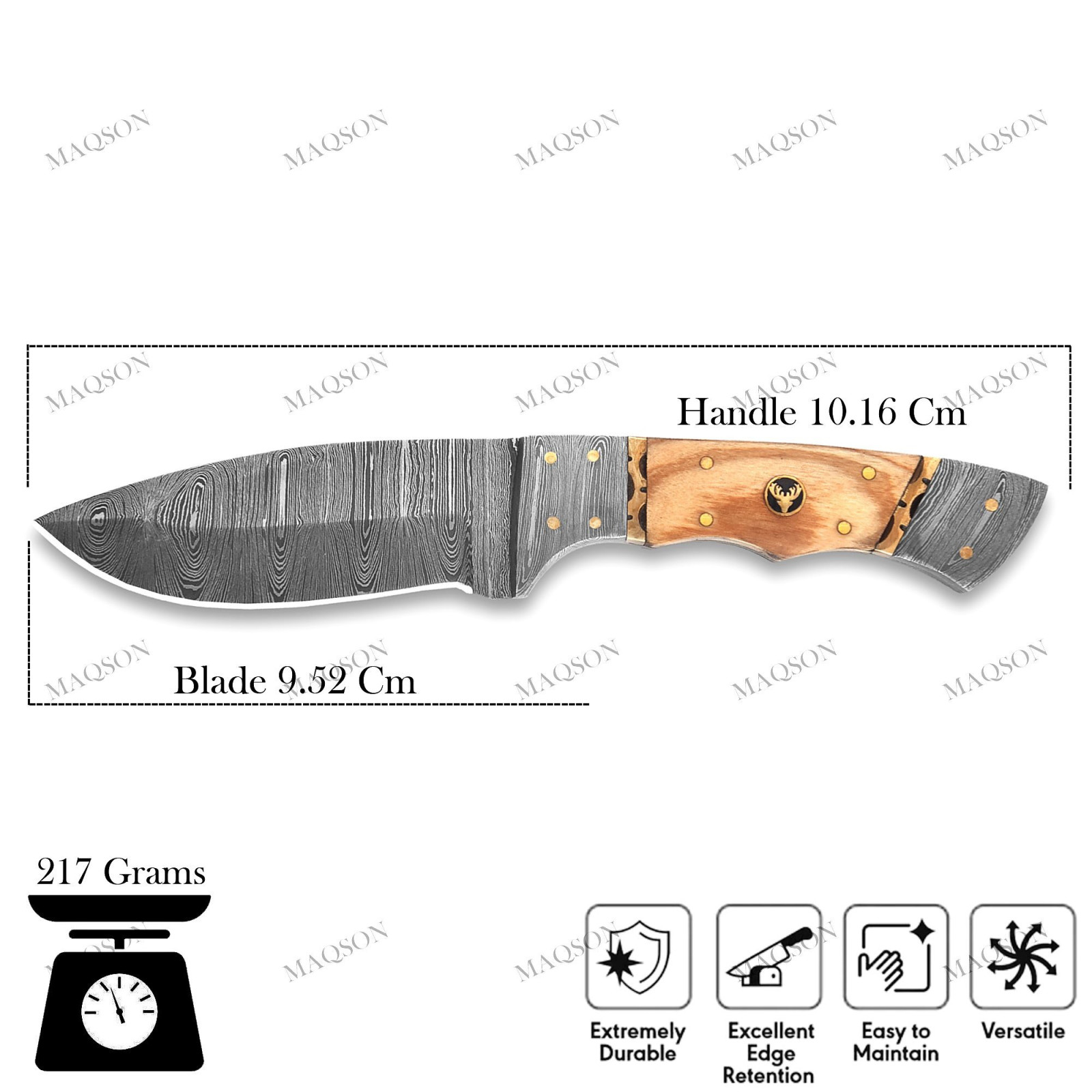 Unser Damaszener wird sehr aufwendig aus zwei verschiedenen Stahlsorten 1095 & 15N20 handgeschmiedet. Durch fünffaches Verdoppeln der Stahllagen und erneutes Schweißen wird die Anzahl der Lagen so vervielfacht. Somit besteht unser Damaszener aus 288 Lagen. Dies zeichnet unsere Messer durch seine lang bleibende Schärfe, Zähigkeit und Härte aus.