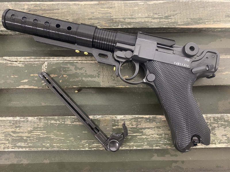 Zum Verkauf steht eine Druckluft (CO2) Pistole Umarex Legends Parabellum Luger P08, optisch zu einem A-180 Blaster umgebaut.