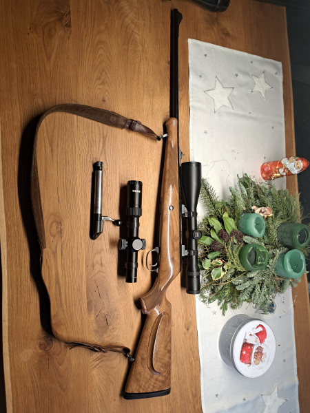 Zum Verkauf steht eine sehr gut erhaltene Mauser 225 im Kaliber .30-06 Springfield. Die Waffe ist technisch in tadellosem Zustand, ebenso die Schussleistung. Vor einigen Jahren wurde die Waffe mit einem edlen Kirschbaumholzschaft ausgestattet. Der Schaft weist leichte Alltagsgebrauchsspuren auf (siehe Fotos). Die Waffe verfügt über einen Rückstecher, offene Visierung und einen Lederriemen. Die Gesamtlänge beträgt 112 cm und die Lauflänge 60 cm. Weiterhin sind auch ein Ansitzglas (Zeiss Diavari 3 - 12 x 56) sowie ein Drückjagdglas (Akah 1- 6 x 24) teil der Auktion. Die Gläser lassen sich einfach mittels Schwenkmontage wiederholgenau tauschen, sodass die Waffe sowohl auf Ansitz als auch auf Bewegungsjagden geführt werden kann. Der Artikel ist erwerbscheinpflichtig (EWB). Verkauf des Artikels nur gegen Abholung. Es handelt sich um einen Privatverkauf, Rücknahme und Gewährleistung sind ausgeschlossen.