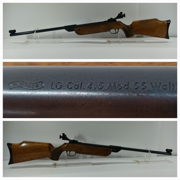 Bei Fragen zum Artikel BITTE ........ Telefon: 07356-9509284 ........ 1.Luftgewehr Walther LG55 Knicklauf Gewehr....... OHNE ** F ** IM FÜNFECK ...... Cal.4,4 Diabolo. Altersgerechtem Zustand. RECHTS SCHAFT/GRIFF. Das Gewehr stammt aus einer Privat Sammlung und ist soweit Ersichtlich Original. Habe das Gewehr mit 10 Schuss Probe geschossen. Das Lg verschießt 4,4mm Muni / 4,5mm bleibt stecken. Nun kann man sich viel Ausmalen. Ich vermute, das es eine reine Dichtungssache oder zu schwache Feder ist. Die Feder schlägt ab. Brünierung schön schwarz und der Schaft sieht noch wunderschön aus. Laufhülse noch verbaut. Somit hat das LG Optisch einen dickeren Lauf..........
