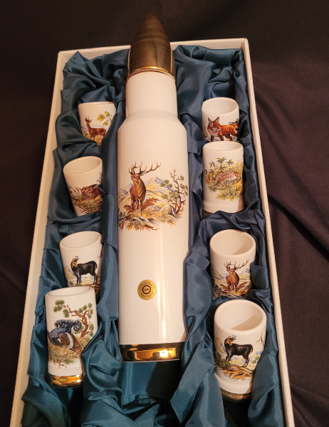 Die 8 Schnapsgläser sind mit schönen jagdlichen Tiermotiven handbemalt.