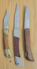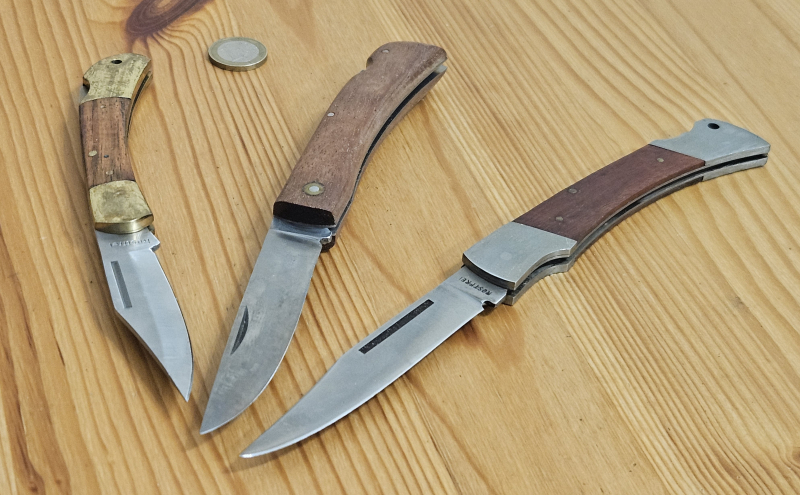 Hallo liebe Egunner, zum Verkauf kommen hier drei große Taschenmesser mit feststellbarer Klinge. Zwei Klingen sind mit "Rostfrei" geprägt. Besonders das kleinere mit dem Messinggriff ist sehr charmant. Das längste misst fast 25cm.