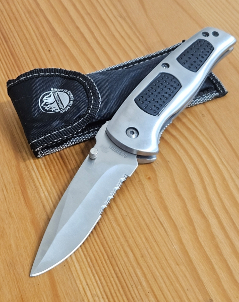 Hallo liebe Egunner, zum Verkauf kommt hier ein schickes Edelstahl-Einhandmesser! Es wird samt Futeral geliefert. Die Klinge besitzt einen Sägeschliff, der das Zerteilen von Fleisch erleichtert. Auch meinen Finger konnte ich ungewollt damit sehr leicht "bearbeiten"... Gesamtlänge 22cm, Klingenlänge 9,5cm. keine Rücknahme, keine Garantie, viel Spaß beim Bieten! :D