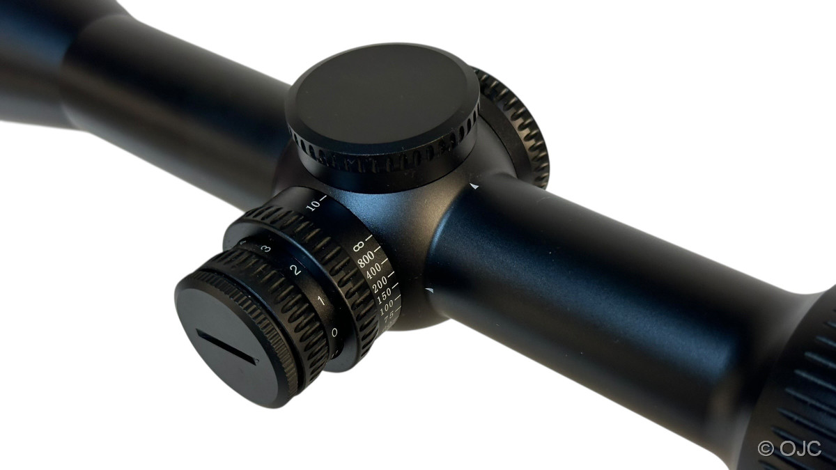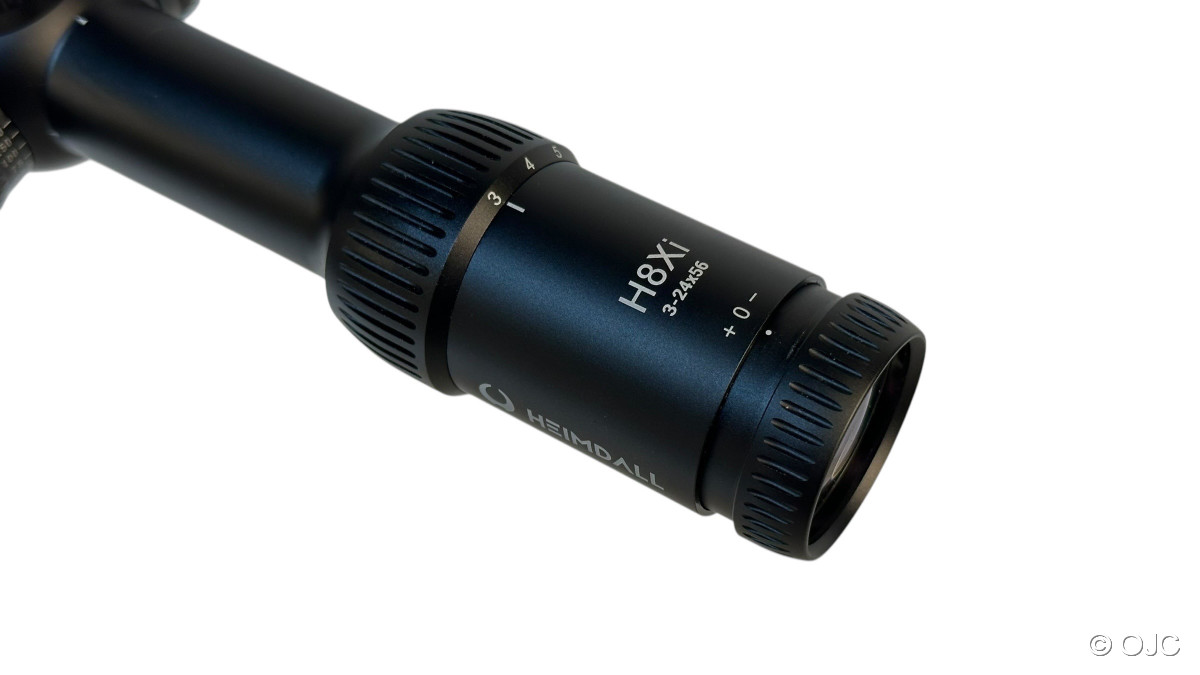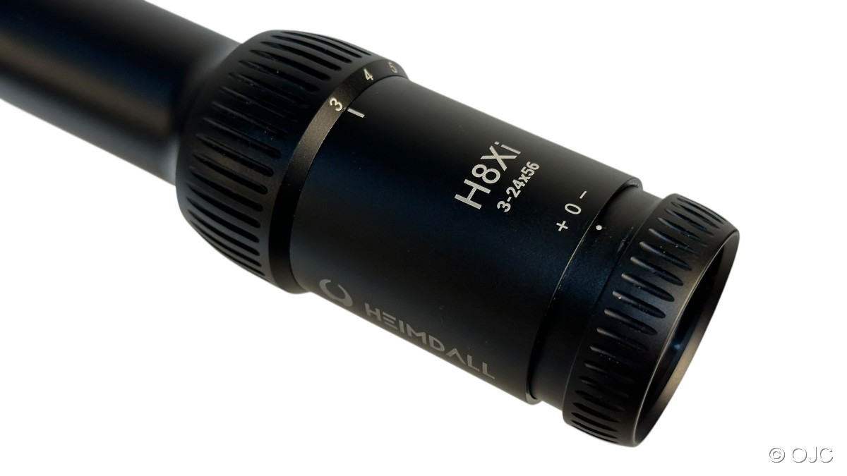 Dieses Heimdall Zielfernrohr bietet einen 8-fachen Zoom, ein feines Fiber-Dot Leuchtabsehen (wie Absehen 4 in der 2. Bildebene), eine typische 1cm Klickverstellung der Türme sowie einen einstellbaren Parallaxenausgleich.