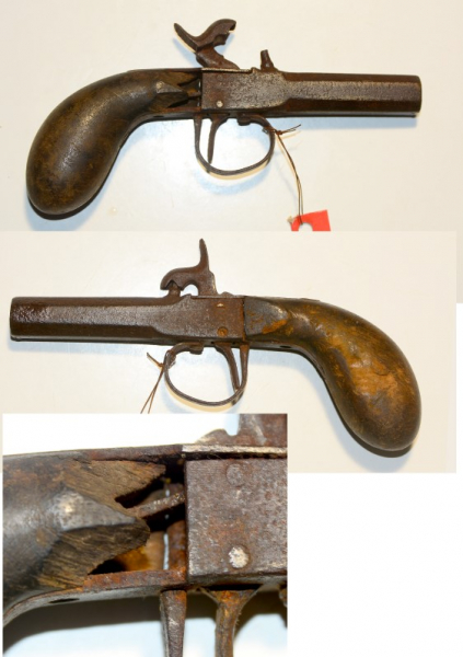 Original Perkussions-Pistole, Terzerol, Lauflänge 5,7 cm, Gesamtlänge 16,5 cm, Kaliber 11 mm, rostig und mit vielen kleinen Defekten und vorn rechts Ausbruch am Holzgriff, Teile beweglich, aber Funktion nicht gegeben, zum Restaurieren oder Ausschlachten