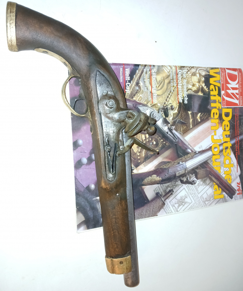 Alte Steinschloss Pistole wohl Original ? 17 / 18 Jahrhundert. Lauf sieht nach Damast aus. Waffe hat starke Gebrauchsspuren. Raste 1 und 2 funktioniert. Ein mal abgeschlagen. Ich habe die Waffe aufgearbeitet , und gereinigt . Verkauf, ausschließlich als Deko oder Sammlerwaffe. Es sind keine Beschusszeichen ersichtlich . Lauf innen durchgehend offen bis Hammer. Ich gebe keine Garantie und Umtausch auf Waffe. Gekauft wie gesehen.