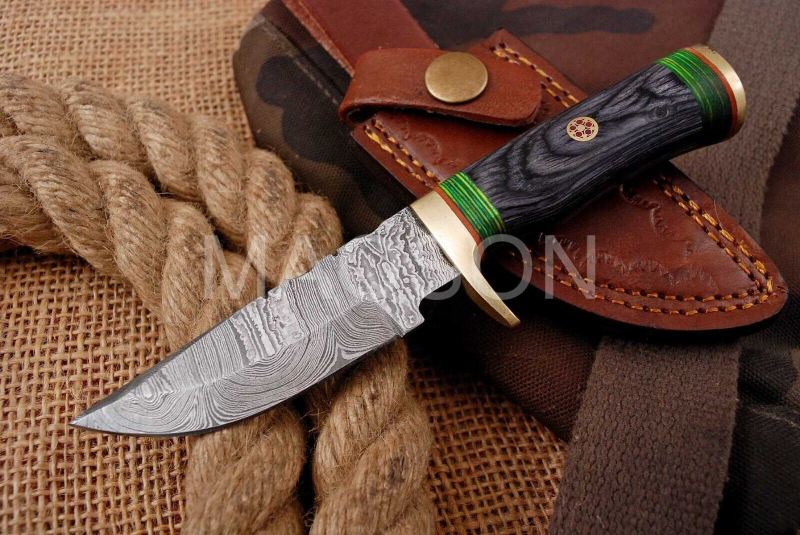 Hier erhalten Sie ein sehr schönes handgeschmiedetes Damast Jagdmesser in reizvollem Torsion Muster.