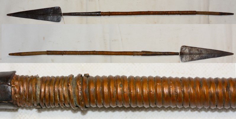Afrikanischer Spieß oder Speer mit 23 cm langer, hinten 65mm breiter Klinge, Gesamtlänge 93,5 cm, 39 cm des Stabes mit handgefertigtem Kupferdraht umwickelt, ursprünglich war wohl der gesamte Stab umwickelt, worauf entsprechende Abdrücke hinweisen