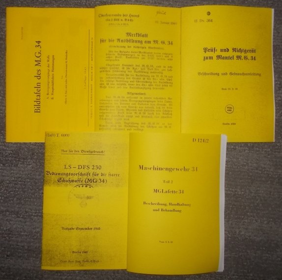 Verkaufe 5 Hefte MG34 Dienstvorschrift Beschreibung Lafette 34 Merkblatt Bildtafel Prüfgerät usw. von 1939-43. Kein Orginal! Reprint.