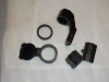 Die Teie sind aus eloxiertem und schwarz eingefärbten Aluminium, welche mit Stahlschrauben verbunden sind. Leider fehlen bei einem Teil 3 Schrauben, welche aber sicher zu ersetzen sind. Der Gummiring mit der Blende hat ein Innenmaß von 43mm und der Schutzring eines von 37mm. Auf Nachfrage werde ich die genauen Maße angeben.