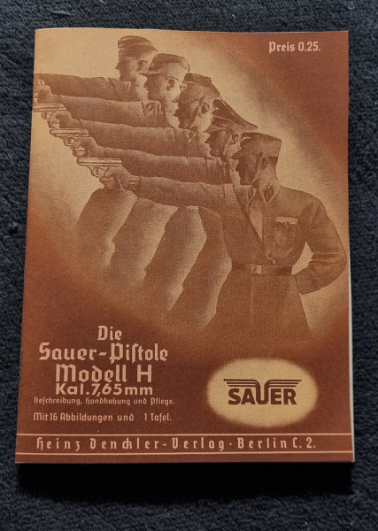 Sehr schöne Sauer-38H-Bedienungsanleitung mit Illustrationen und technischen Angaben die Pistole 38, Modell h aus Sammleranfertigung. "Die Sauer-Pistole Mod.H" Verlag Heinz Denker Verlag, Berlin C.2.