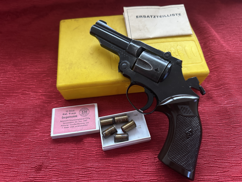 Aus großer Sammlung ,die aufgelöst wird,viel schönes,seltenes dabei aus den besten,frühen Zeiten von Reck,Röhm,Arminius,Erma usw..Wird demnächst eingestellt,bei Interesse einfach anschreiben!Hier einer der seltenen seltenen Kipplauf- Revolver von dem Hersteller scharfer Schusswaffen Perfecta!Zuerst als scharfes Modell von Perfecta konzipiert und gebaut in den 70-er Jahren ,dann ,als es noch möglich und erlaubt war,kam auch diese,freie PTB-Version auf den Markt,selbstverständlich mit allen qualitativen Eigenschaften des scharfen Modells,bis auf den scharfen Schuss!Cal.9mm Knall&Gas,Beschussjahr 1977.Gesuchte ,frühe Version mit der Besonderheit,dass der Lauf praktisch nur verengt ist- frei ohne Sperre wie man sieht ! Gute,damalige Güte&Qualität,die es so leider nie wieder geben wird !Besonders bei diesem Modell macht es es Spaß ,weil ,wie damals noch üblich und erlaubt, heute wäre es so leider absolut undenkbar, wegen verschärften PTB-Vorgaben!Die Trommel ist ,wie man sieht ebenfalls nur minimalan verengt!Leider konnten sich viele Bastler speziell bei solchen,stabilen,hochwertigen Revolvern einfach nicht zurückhalten,sodass der Gesetzgeber /PTB verständlicherweise reagieren musste.Schade!Sammler und Kenner sind hier bestens informiert...sehr schöne Mündung von vorne...so seit über 40 Jahren nicht mehr in der Produktion,nur Altbestand zählt,was man hat,hat man...Komplett so mit dem ganzen Zubehör wie aus den Bildern ersichtlich.Original so komplett mit allem.Was man hat ,hat man,Nur Altbestand zählt.Für Systemsammler ein Muss ,weil so komplett als Kipplaufrevolver ohnehin eine Rarität!Die Bilder als Beschreibung beachten.Guter Zustand.Frei ab 18.Private Versteigerung ab 1€ ohne Rücknahme.EU-Länder Ausland Versandkosten 20€.
