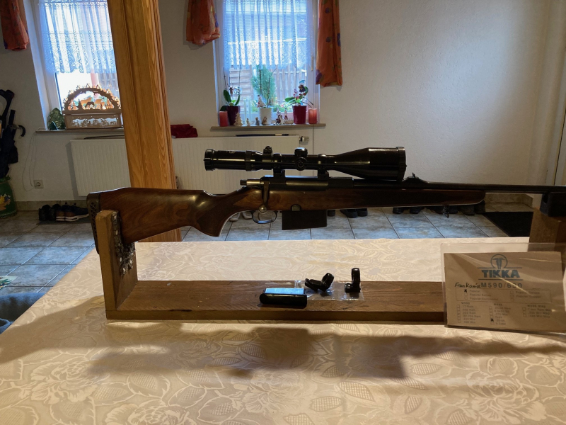 Sie bieten auf eine Jagdwaffe Tikka M690 Kaliber 30-06 mit Schaftkappe, Abzug ist einstellbar. 2 Magazine 6 und 3 Schuss. Lauf top, Lauflänge 56 cm, Gesamtlänge 110 cm.