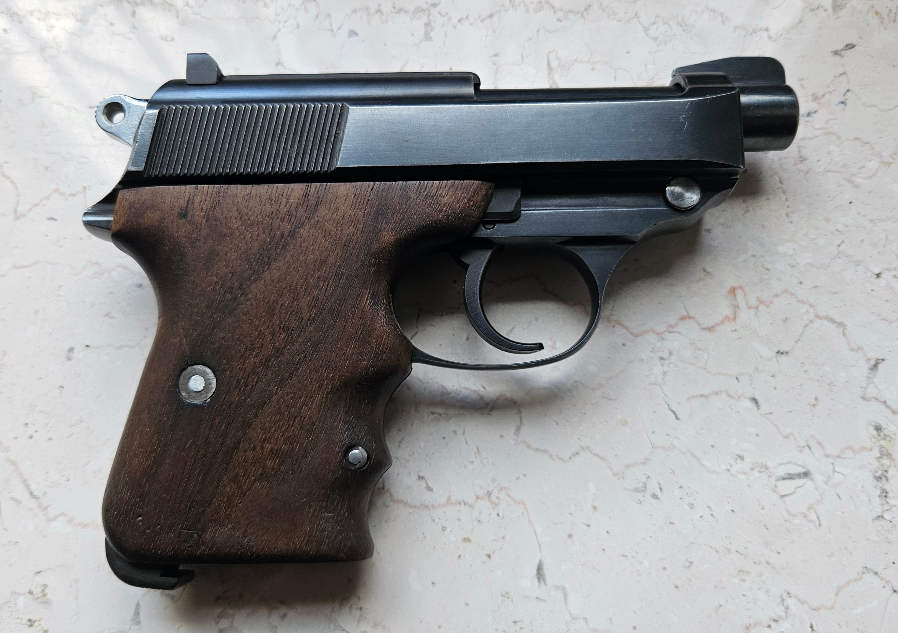 Die Waffe sieht mit dem kurzen Lauf gänzlich anders aus als eine P4 üblicher Bauart. Ich habe keinerlei Kenntnis ob das ein Sondermodell, ein Einzelstück, eine Modifikation oder was auch immer sonst das ist und von wem diese ggf. durchgeführt wurde. Der Vorbesitzer hatte einmal angedeutet, die Waffe sei aus Beständen der Polizei zu ihm gelangt. Das gebe ich hier einfach wieder. Gesicherte Erkenntnisse dazu oder anderes Wissen zur Geschichte der Waffe habe ich nicht. Die vermutlich ursprünglich anderen originalen Griffschalen sind und waren leider nie vorhanden bzw. in meinen Besitz gekommen