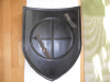 Biete einen mittelalterlichen Schild aus Stahlblech an. Der Schild besteht aus ca.2mm starkem geprägtem Stahlblech, ist 58 cm hoch und seine Breite ist 46 cm mit Fantasiebemalung. Hinten sind Halteösen mit Riemen zum handhaben angebracht.