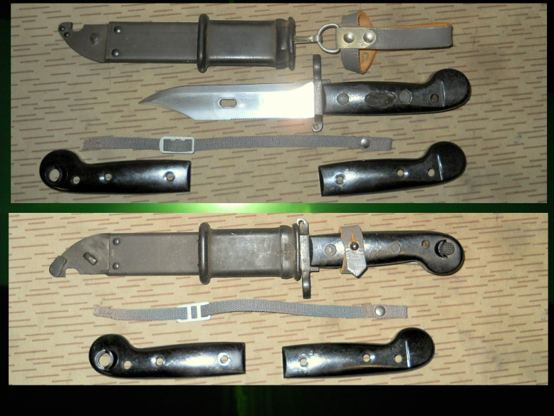 ...Beschreibung: ... original DDR/NVA Bajonett/Seitengewehr … für Kalaschnikow AK47/AKM … inkl. Koppelschlaufe … eine Griffschale beschädigt – sonst recht guter, gebrauchter Zustand … den fehlenden Faustriemen und einen Satz Griffschalen lege ich als originale Neuteile dazu