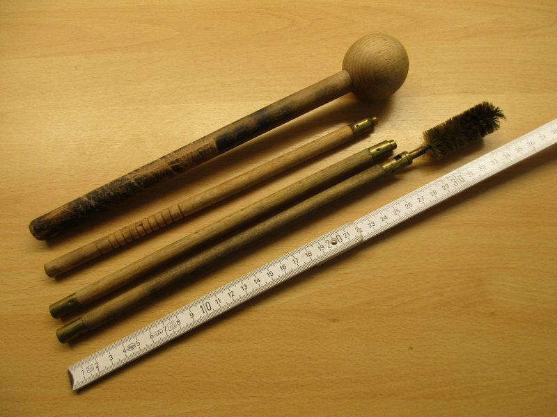 Sie bieten auf eine gebrauchte Reinigungs.- und Ladegarnitur für Vorderlader bis cal .75 und Flinte bis cal .12 und einen Kugelstarter, beide aus Holz. Länge des 3-teiligen Ladestockes ist 82 cm ohne Aufsatz. Die Garnitur hat mittlere Gebrauchsspuren, siehe Bilder. Alle Gewinde funktionsfähig. Zustand und Lieferumfang, siehe Bilder. Privatverkauf ohne Gewähr.