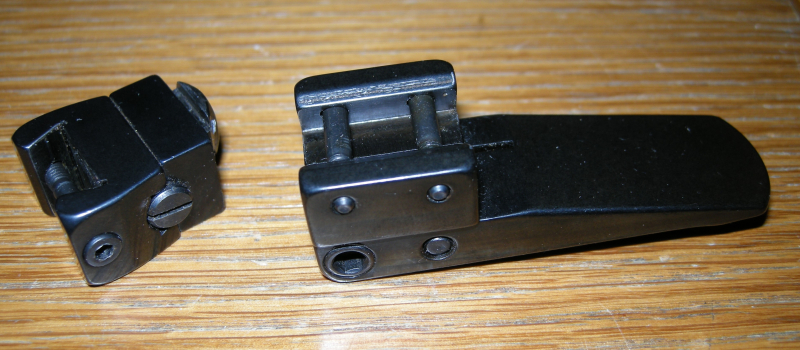 Sie bieten auf EAW Schwenkmontage-Oberteile für Zielfernrohre mit Schiene. .Der Vorderfuß hat eine Kröpfung von 45 mm, der Hinterfuß eine Bauhöhe von 6 mm. Der Zustand der Teile ist sehr gepflegt.