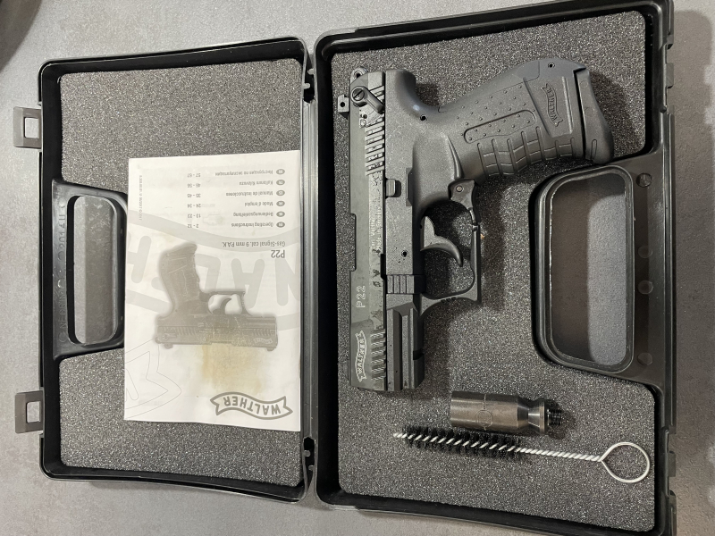 Es ist eine Walther P22 Gas Signal Kaliber 9 mm P.A.K. Mit der Beschreibung, Koffer und Zubehör.