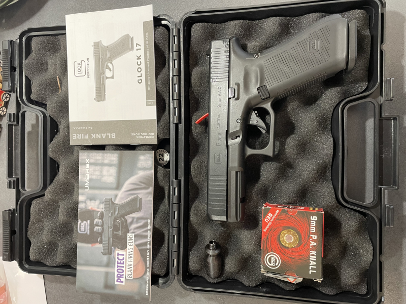 Es ist eine Clock 17 Gen 5 Kaliber 9 mm P.A.K. Mit Beschreibung, Koffer und Zubehör.