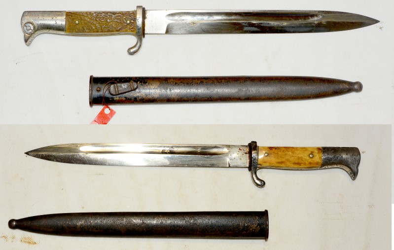 Deutsches Bajonett 84/98 für K98k 2. Weltkrieg, Griffschalen aus Hirschgeweih, außen naturbelassen, innen glatt geschliffen, Ausgehversion ohne Herstellerangabe, Verchromung und Scheidenlack mit Fehlstellen