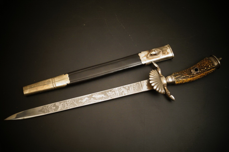 Fundzustand. Lederscheide mit Nummern in den Beschlagteilen. Alle Teile am Griff aus Bronze, versilbert. Echter Horngriff mit DJ Abzeichen. Klinge geschmiedet und mit Zierätzung. Sehr feiner Hirschfänger.