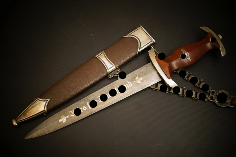 Fundzustand. Stahlscheide und geprägte neusilber Beschlagteile. Kette aus Neusilber mit besonderem RZM Hänger. Klinge mit Stempeln auf der Angel wie P+D und DAMAST. Hersteller Eickhorn auf der Klinge und erhabene goldene Zierätzung. Holzgriffstück mit Neusilberadler und Pastille mit Glasemaille - leicht schimmernd. Parierstange mit Schmiednummer - matching. Scheide ist mit braunem Saffianleder bezogen - keine Schäden. Traumhaftes Stück - wohl kaum wieder zu finden !!!