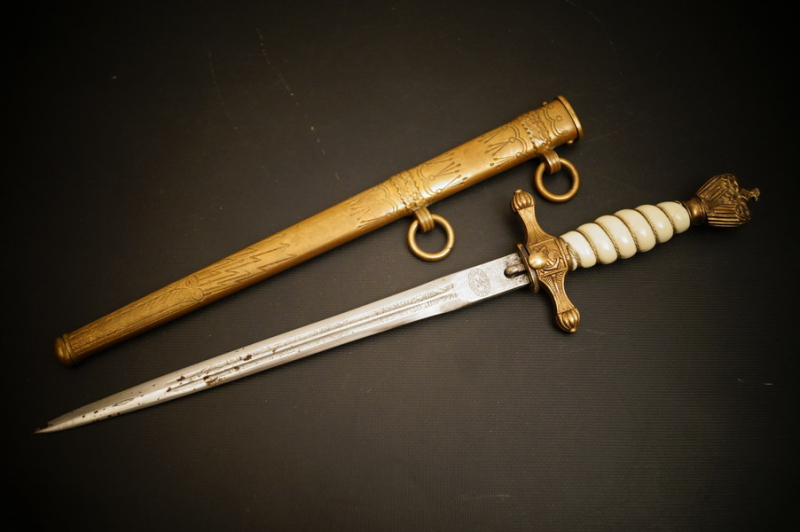 Fundzustand. Bronzescheide und Bronzebeschlagteile am Griff. Stahlklinge mit Hersteller und Zierätzung. Griff ohne Risse, Cellon. Stärker getragen aber selbst der Drücker geht noch.