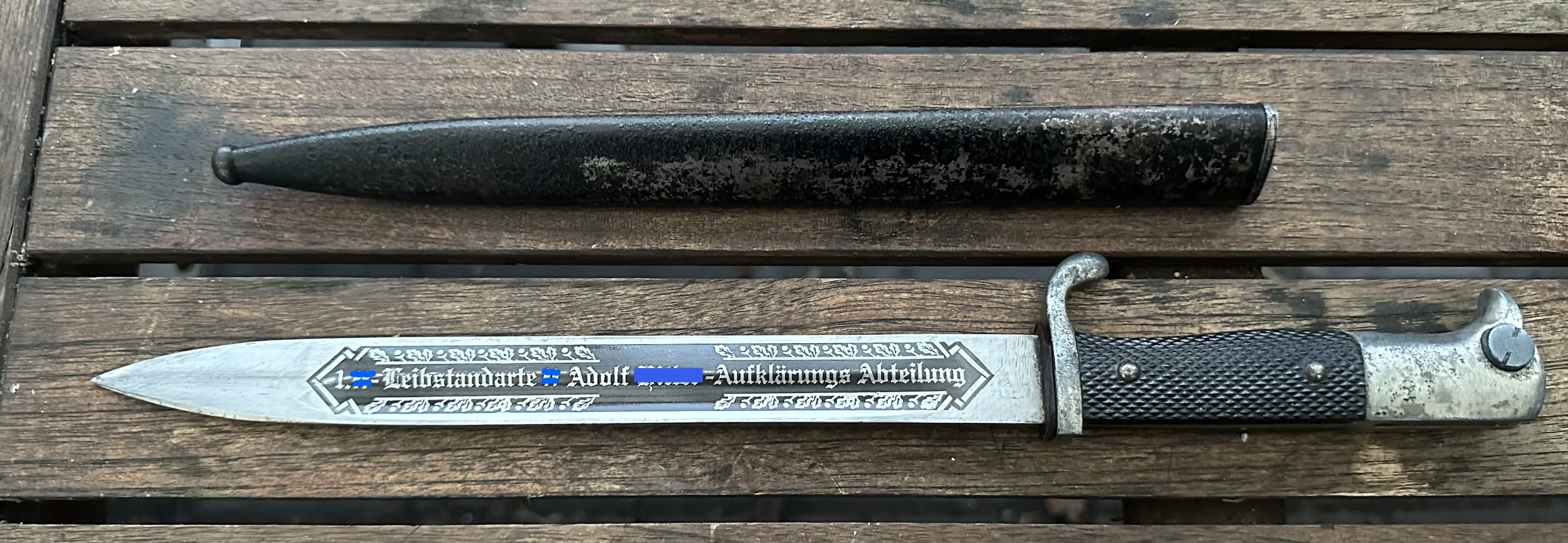 Extra Seitengewehr Bajonett mit Klingenätzung / Gravur „1. XX Leibstandarte XX A.H. - Aufklärungs Abteilung“ umschlungen von Eichenlaub. /