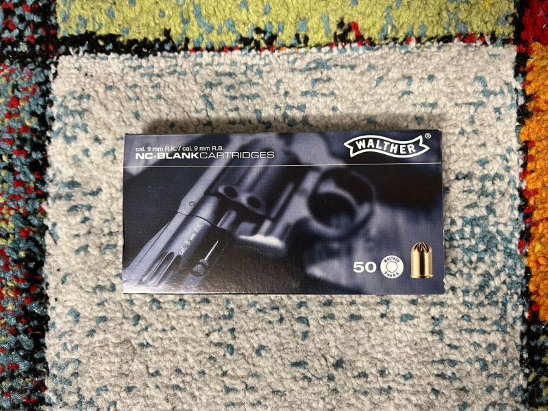 Zum Verkauf steht je Sofortkauf eine Packung 9mm RK Platzpatronen der Marke Walther für Schreckschuss Waffen.