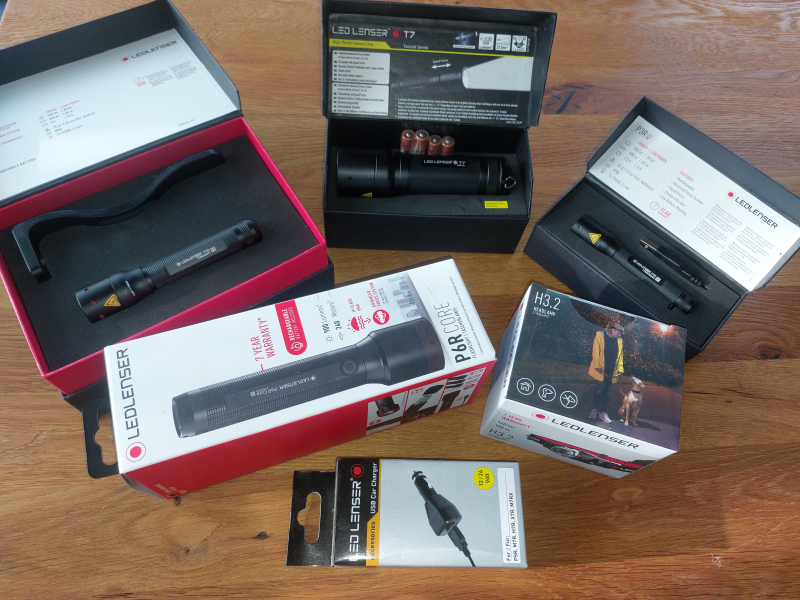 Taschenlampenset LED Lense, bestehend aus: P6R Core, P5R, T7, P3R, Kopflampe H3.2 und USB Autoadapter