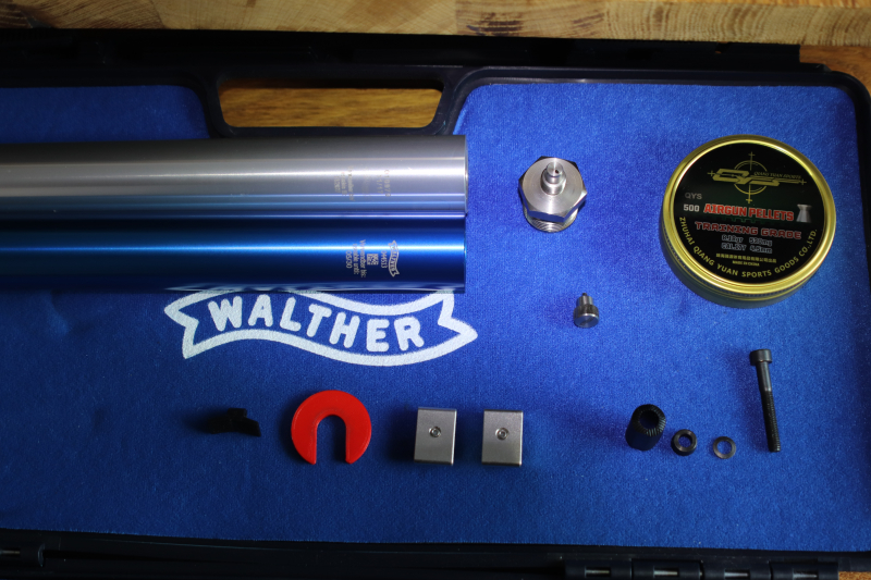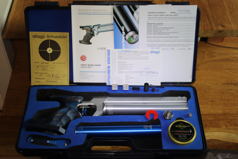 Sie wurde pfleglich behandelt und ab und zu beschoßen, damit alles in Ordnung bleibt. Sie hat ca. 3000 Schuss verschossen und ist somit höchstens eingeschossen. Abnutzungsspuren muss man suchen. Einen Kratzer hat sie leider durch den Ehering, auf dem Ladebügel. (siehe Bild) Sie wurde immer mit Waffenöl/ Fett gepflegt. Meiner Meinung nach die schönste Lupi auf dem Markt. Natürlich stehe ich auf Blau, wie man erkennt. Auf den Bildern sieht man eine Schusskarte die ich am 20.12.25 nochmal auf 10m Freihand geschossen habe um zu prüfen, das die Waffe tut was sie soll. (Alle nicht 10ern sind mein "Nicht-Können") Die Waffe schießt absolut präzise. Sie hat einen blauen Schichtholzgriff mit allen Zubehörteilen zu dem Griff. Zudem hat Sie ein blauen Alu Abzug erhalten der nochmal viel besser zu bedienen ist wie der Serienstandard der bei liegt. Man kann die Waffe wie kaum einen andere so schön an seine Bedürfnisse anpassen. Probleme mit Kartuschen oder verstellen des Abzugs wie manch frühere Serien der LP 400, laut Foren berichten, hat dieses späte Exemplar nicht. Es sind zwei Kartuschen dabei. Die silberne hat TÜV bis 11/27 danach, wenn sie abgelaufen ist, kann man mit dem beiliegenden originalen Walther Gutschein, kostenlos eine nagelneue Kartusche bekommen und hat wieder für 10 Jahre ruhe. Die seltene blaue Kartusche hat TÜV bis 05/30. Somit kann man auch diese, lange Zeit fröhlich nutzen. Die Gewinde wurden regelmäßig mit etwas dichtungsfett gepflegt und steht's gerade und behutsam eingedreht. Eine rote Distanzscheibe für den sicheren Transport der Kartuschen an der Pistole, ist dabei. Zudem an Zubehör gibt es: 1x Kartuschenfüllventil 1x zwei original Gewichte 1x Walther Werkzeug und sehr praktisch 1x das kleine Sight Tool zum einfachen und schnellen verstellen des Visiers. 1x Originale Anleitung der Waffe 1x Kartuschen Gutschein und zu guter letzt noch eine nagelneue Packung Qing Yuan Diabolos. Die Waffe kommt in dem blauen Walther Deluxe Koffer.