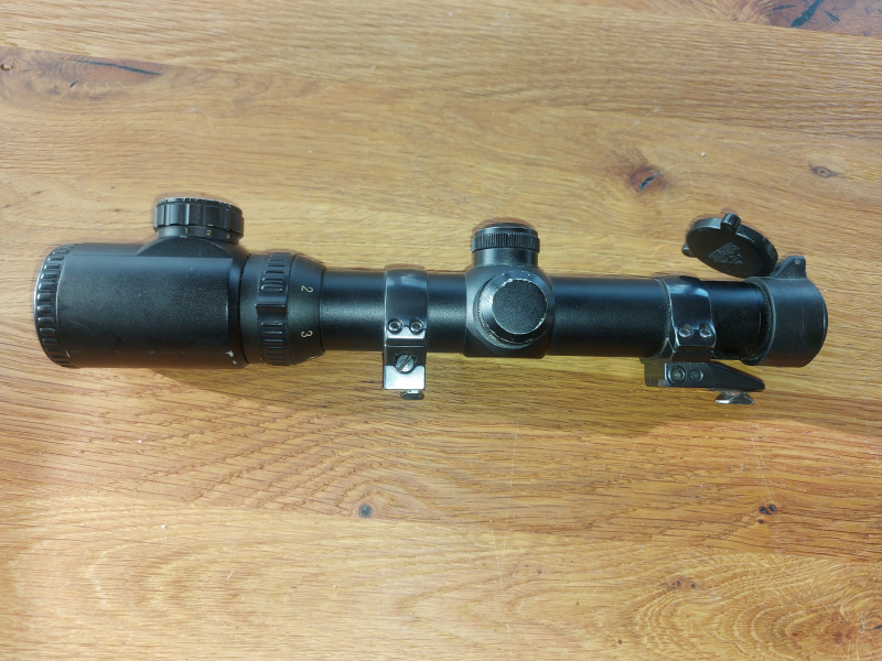 Zielfernrohr Sutter 1,25-4,5x24 inkl. Schwenkmontageoberteile, Achtung Okularlinse wackelt. Ob das normal ist kann ich nichtbeinschätzen. Bild ist trotzdem klar!, Absehen 4